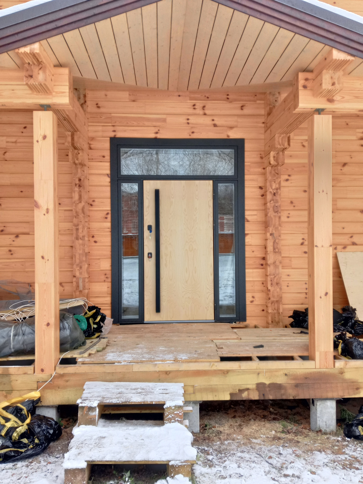Входные двери с фрамугой используют в квартирах и частных домах в Струнино, где проёмы выше типовых. Вставка может быть глухой или светопрозрачной: первая работает как продолжение двери, вторая даёт естественное освещение в прихожей и визуально «поднимает» потолок.